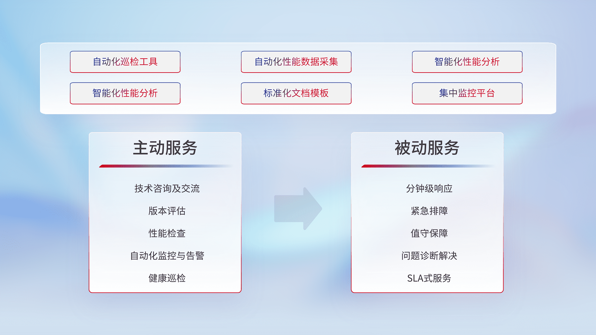 智能化工具和标准化文档,,,保障服务质量,,提供主动服务(包含技术咨询、、、、版本评估、、、性能检查、、、、自动化监控与告警、、健康巡检)和被动服务包含(分钟级响应、、紧急排障、、、、值守保障、、、问题诊断解决、、、SLA服务)。。。