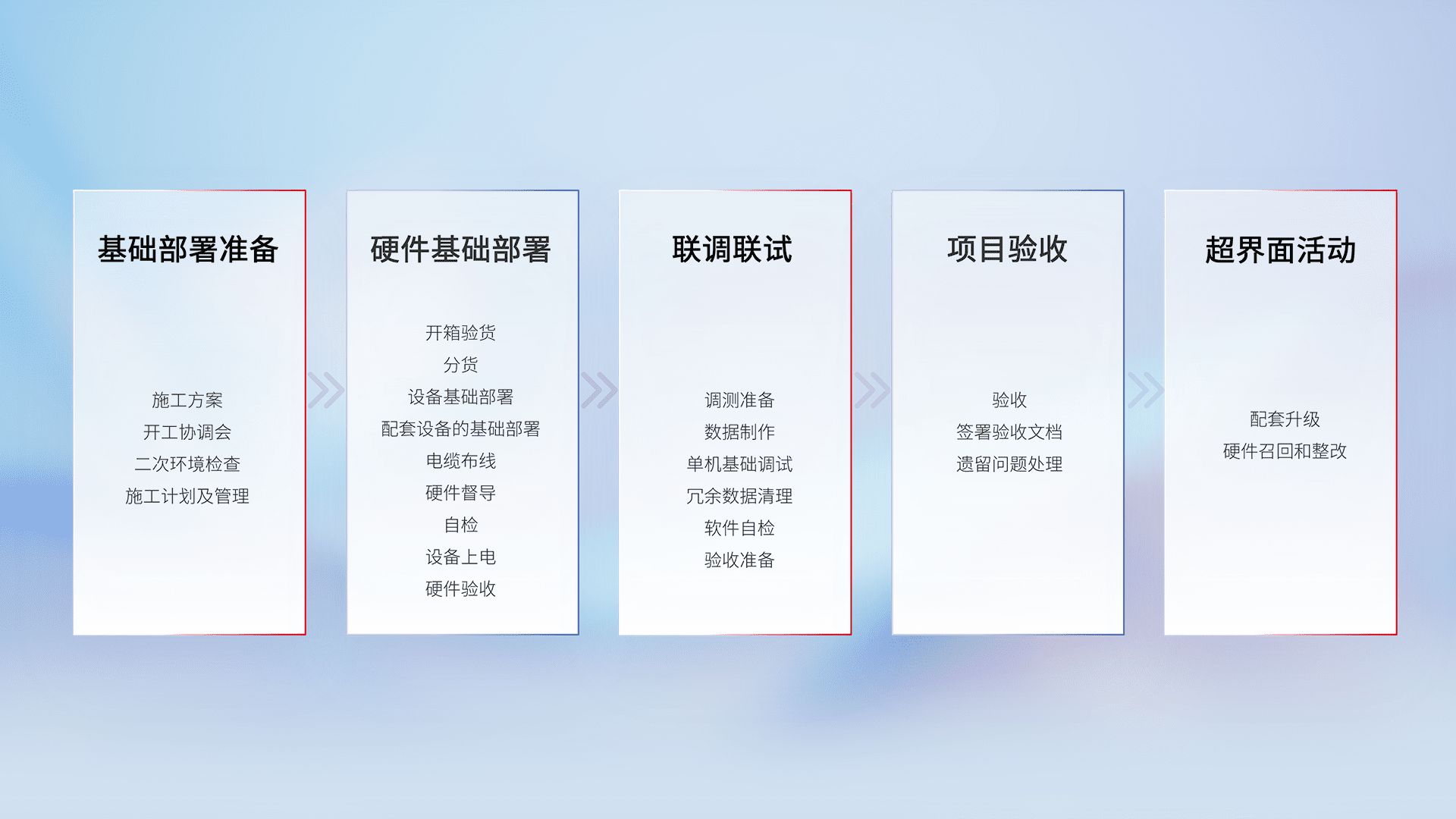 从基础部署准备、、、硬件基础部署、、、联调联试、、、项目验收、、、、越界面活动的全过程可追溯,,,保证施工质量和进度。。。。